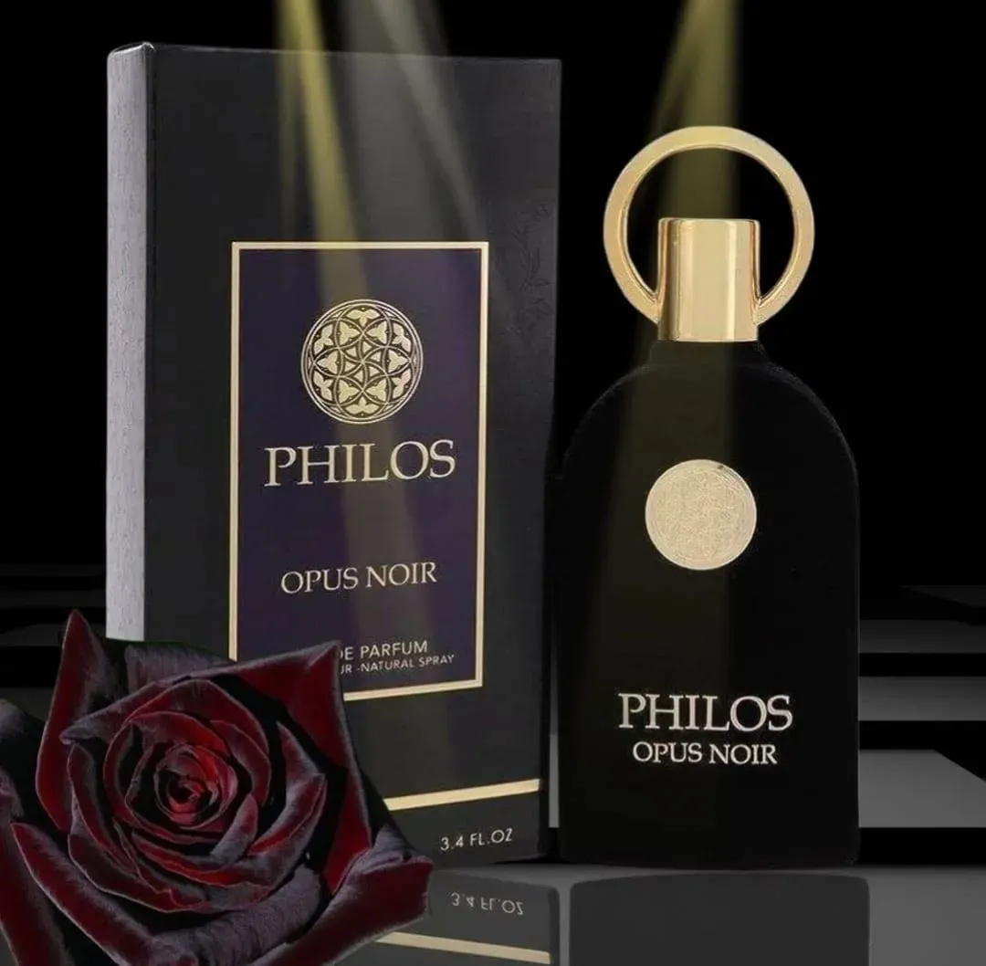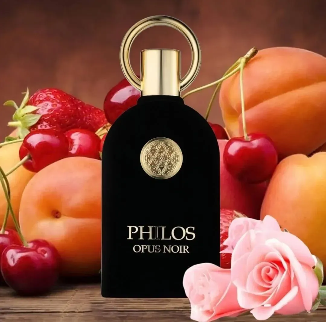 Perfumes Árabes Calidad G5 para mujer Philos Opus Noir es una fragancia de la familia olfativa Amaderada. Las Notas de Salida son frutas y rosa turca; las Notas de Corazón son ylang-ylang, cuero, nuez moscada y ámbar; las Notas de Fondo son pachulí, vaini